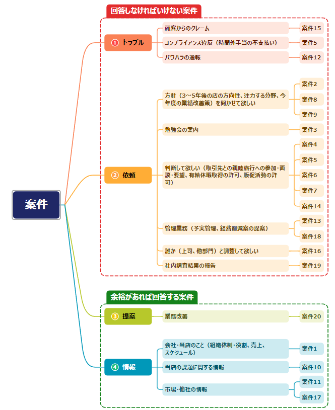 「情報」:会社や支店に関する情報が書かれた案件 下図は、案件を分類したものです。