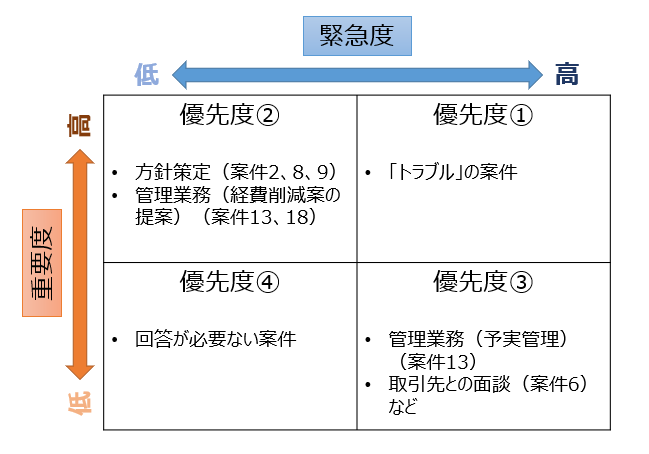 「重要度:高、緊急度:低」と「重要度:低、緊急度:高」のどちらから処理するかは悩ましいです。ただ、私としては、管理職に期待されているのは、「重要度:高、緊急度:低」のような方針策定や管理業務だと思いましたので、このようにしました。