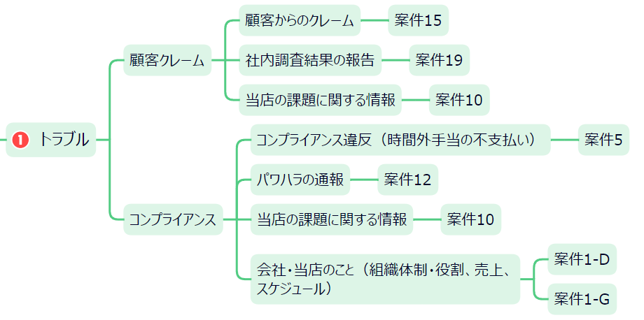 トラブルを大きく「顧客クレーム」と「コンプライアンス違反」で分けて、それぞれに紐づけました。